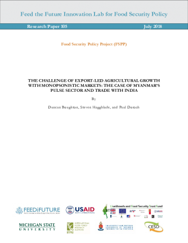 This paper report examines 1) the evolution, structure, and performance of Myanmar’s pulse sector, 2) the trade relationship with India, and 3) policy options to respond to the current crisis while addressing underlying weaknesses that threaten the sector’s long-term international competitiveness. The report identifies three complementary and mutually reinforcing avenues for propelling Myanmar’s pulse markets forward to increasingly higher levels: 1) expanded export earnings (from new markets and higher value added products); 2) improved farm productivity; and 3) increased domestic demand.