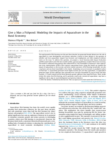 The rapid growth of fish farming over the past three decades has generated heated debate over the role of aquaculture in rural development and poverty reduction. Central to these debates is the question of whether and how aquaculture impacts local incomes and employment, yet little empirical evidence exists on the issue. To address this question, we propose a Local Economy-wide Impact Evaluation (LEWIE) model which nests fish farm models within a general-equilibrium model of their local economy. The model is calibrated using primary data collected from 1102 households in Myanmar’s main aquaculture zone, representative of 60% of the country’s aquaculture farms. Using this model, we examine the impact of aquaculture on the incomes and labor market outcomes of fish farming households, but also crop farms and non-farm households in the cluster. Simulating one-acre increases in pond/plot surface we find that: (1) aquaculture generates much higher incomes per-acre than agriculture; (2) aquaculture generates larger income spillovers than agriculture for non-farm households by way of retail and labor