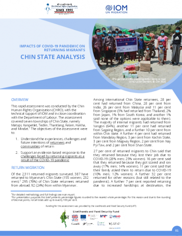 This rapid assessment was conducted by the Chin Human Rights Organization (CHRO), with the technical support of IOM and in close coordination with the Department of Labour. The assessment covered seven townships of Chin State, namely Matupi, Kanpetlet, Tedim, Thantlang, Falam, Hakha, and Mindat with the objectives of the assessment to understand the experiences, challenges and future intentions of returnees and communities of return and to support an evidence-based response to the challenges faced by returning migrants as a result of the COVID-19 pandemic.