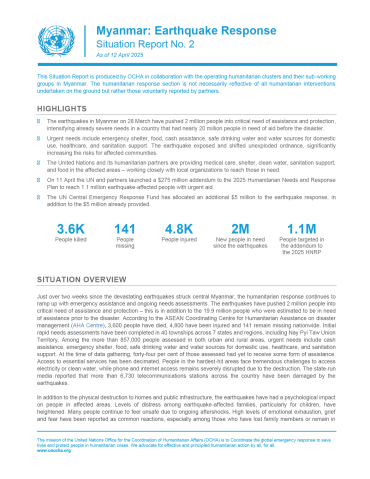 Just over two weeks after the devastating earthquakes struck central Myanmar, the humanitarian response continues to ramp up with emergency assistance and ongoing needs assessments. The earthquakes have pushed 2 million people into critical need of assistance and protection. This is in addition to the 19.9 million people who were already estimated to be in need of assistance before the disaster. According to the ASEAN Coordinating Centre for Humanitarian Assistance on disaster management (AHA Centre), 3,600 people have died, 4,800 have been injured, and 141 remain missing nationwide. Initial rapid needs assessments have been completed in 40 townships across 7 states and regions, including Nay Pyi Taw Union Territory. Among the more than 857,000 people assessed in both urban and rural areas, urgent needs include cash assistance, emergency shelter, food, safe drinking water and water sources for domestic use, healthcare, and sanitation support. At the time of data gathering, 44 percent of those assessed had not yet received any form of assistance. Access to essential services has been decimated. People in the hardest-hit areas face serious challenges in accessing electricity or clean water, while phone and internet services remain severely disrupted due to the damage. The state-run media reported that more than 6,730 telecommunications stations across the country were damaged by the earthquakes.