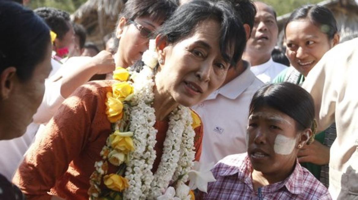 Myanmar pro-democracy leader Aung San Suu Kyi looks around a field project in a village in Pakoku township January 31, 2012. The United Kingdom will be hosting a visit by Suu Kyi to a Department For International Development (DFID) funded livelihood project in the dry zone near Pakoku. The project is run by a local partner which the DFID supports through multi-donor LIFT funds (Livelihoods and Food Security Trust Fund).
