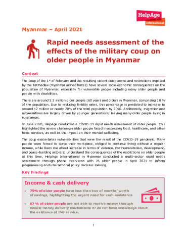 The coup of the 1st of February and the resulting violent crackdowns and restrictions imposed by the Tatmadaw (Myanmar armed forces) have severe socio-economic consequences on the population of Myanmar, especially for vulnerable people including many older people and people with disabilities.