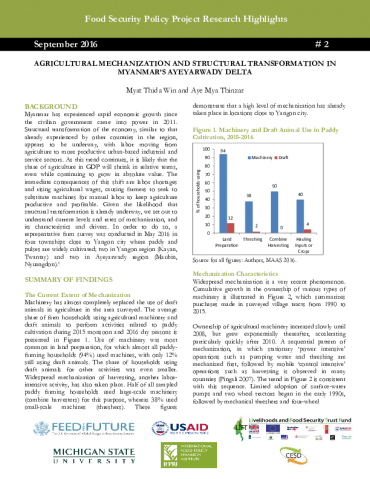 Food Security Policy Project Research AGRICULTURAL MECHANIZATION AND STRUCTURAL TRANSFORMATION IN MYANMAR’S AYEYARWADY DELTA By Myat Thida Win and Aye Mya Thinzar September 2016 Full Report (English): Read Download Full Report (Myanmar): Read Download