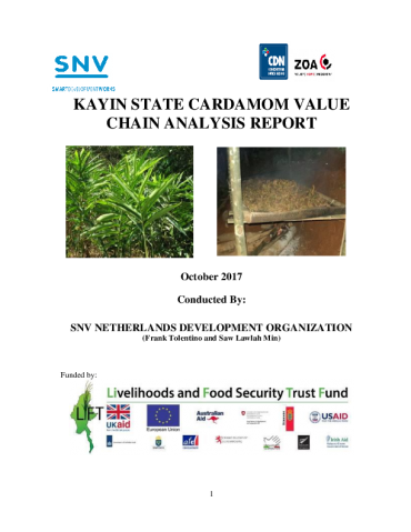 This Cardamom Value Chain Analysis was conducted as part of the technical support of SNV Netherlands Development Organization (SNV) to the Consortium of Dutch NGOs (CDN) in the framework “Improving the Incomes and Nutrition Outcomes of Rural Poor in Northern Kayin State” project. The study was undertaken from March to May 2017 and covered the assessment of the production and trade in selected townships in Kayin State. The downstream markets have been assessed from the product source to the regional trading hub in Taunggoo and import/export points on the Myanmar-China border.