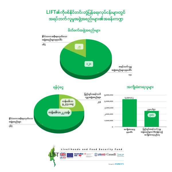 LIFT ၏ သင့်တင့်လျောက်ပတ်သော အလုပ်အကိုင်နှင့် လုပ်သားရွှေ့ပြောင်းမှုအတွက် ပံ့ပိုးမှုစီမံကိန်း အနေဖြင့်လည်း နိုင်ငံတဝှမ်းရှိ တိုင်းနှင့်ပြည်နယ် အတော်များများ - ရန်ကုန်၊ ကရင်၊ မွန်၊ ရှမ်း၊ တနင်္သာရီ၊ ပဲခူး၊ ချင်း၊ မန္တလေး၊ မကွေး နှင့် ဧရာဝတီတို့ရှိ အကျိုးခံစားရသူပေါင်း ၃၅၅,၆၇၃ ဦး (အမျိုးသမီး ဦးရေ ၅၈% ပါဝင်) ကို အရေးပေါ်ပံ့ပိုးမှုများ ပေးအပ်နိုင်ခဲ့သည်။ ယခုကဲ့သို့ မသေချာ မရေရာလှသည့် အချိန်ကာလအတွင်းတွင် ထိထိရောက်ရောက် ပံ့ပိုးဆောင်ရွက်နိုင်ခဲ့ခြင်း၏ နောက်ကွယ်မှ အဓိက အချက်မှာ ပြည်တွင်း အရပ်ဘက်အဖွဲ့အစည်းများ နှင့် အလုပ်သမားရေးရာအဖွဲ့အစည်းများ၏ အကျပ်အတည်းကာလအတွင်းမှာသာမက ယင်းမတိုင်မီအထိ အကောင်ထည်ဖော်ရေး နှင့် စီမံခန့်ခွဲရေး လုပ်ငန်းရပ်များတွင် ပါဝင်ဆောင်ရွက်နိုင်ခဲ့မှုကြောင့်ပင် ဖြစ်တော့သည်။ ပြည်တွင်းအဖွဲ့အစည်းများအနေဖြင့် လိုအပ်သည့် နေရာများတွင် မြန်မြန်ဆန်ဆန်စုစည်း လုပ်ဆောင်နိုင်သည်ဖြစ်ရာ ယင်းအဖွဲ့များသည် နယ်စပ်ဒေသများမှ ရွှေ့ပြောင်းလုပ်သားများ၊ ဌာနေ ရပ်ရွာလူထုများ နှင့် ရွှေ့ပြောင်း ဆိုက်ရောက်လာသူများအား LIFT မှ ပံ့ပိုးပေးသည့် လုပ်ငန်းများ၏ ကျောထောက်နောက်ခံ ဖြစ်လာခဲ့သည်။
