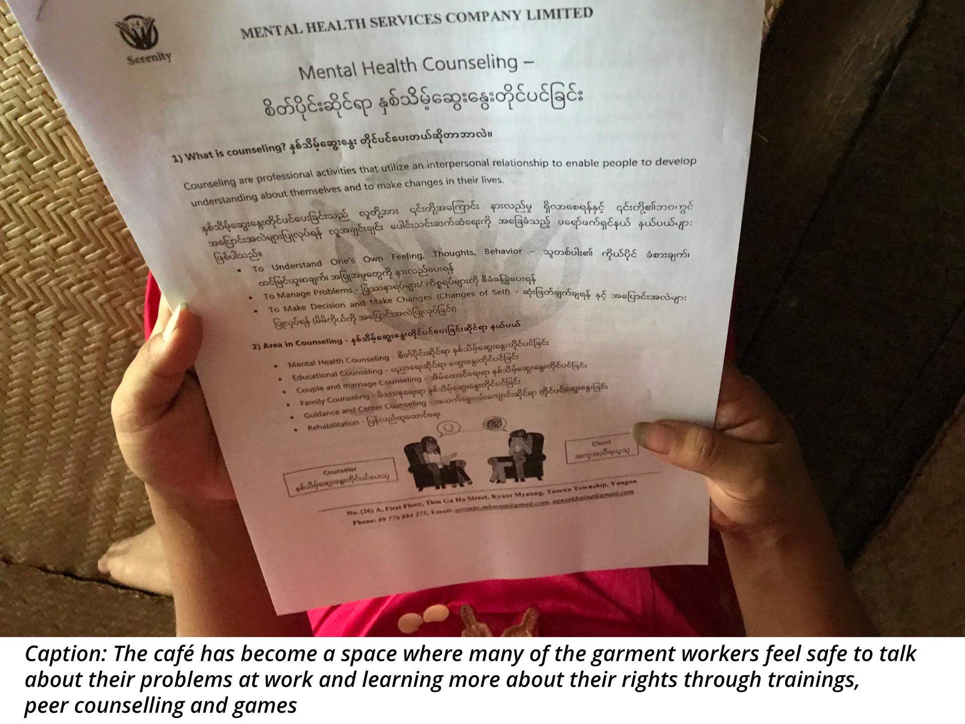Amidst the 2021 health and political crises in Myanmar, Ma Thu* dropped out of high school and started to work in one of over 400 garment factories in Yangon’s industrial zone of Hlaing Thar Yar township to support her family. With the stressful weight of supporting her family, the young woman found support and relief in the Women’s Café, established to provide women garment workers with space for receiving social services and advice.