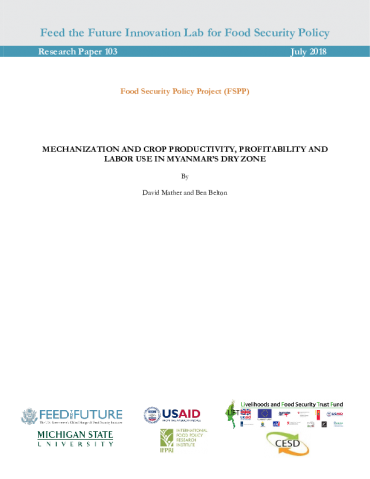 This paper analyzes differences in productivity, profitability and labor use for four major crops produced in Myanmar’s Dry Zone, namely monsoon paddy, dry season paddy, sesame, and groundnut, comparing farmers using mechanized land preparation relative to use of animal draft power alone, and comparing farmers using mechanized harvesting/threshing relative to manual or mixed techniques. Analysis is based on data collected by the Rural Economy and Agriculture in the Dry Zone survey (READZ) from 1,578 rural households in four townships in Myanmar’s central Dry Zone in 2017