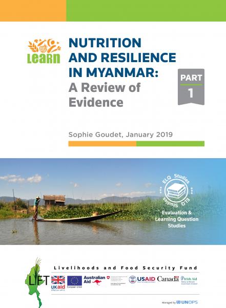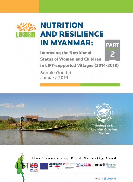 Nutrition and Resilience in Myanmar: Improving the Nutritional Status of Women and Children in LIFT-Supported Villages 2014-2018 (Nutrition Part 2): This study presents an in-depth analysis of LIFT 2015 and 2017 Nutrition Survey data through a nutrition-resilience lens. It first provides an overview of LIFT’s nutrition-related programmes and then measures nutrition-related changes at the village level, the household level, and individual level, including stunting and wasting rates of children and underweight measurements and dietary diversity of mothers. It also explores the drivers of child stunting and wasting and women’s nutrition, as well as the effects of shocks and stresses on nutrition outcomes. Will be made available soon.