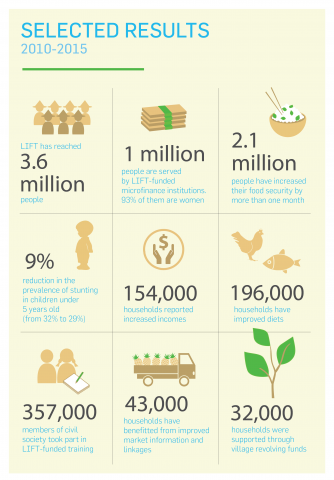 LIFT achieved or exceeded its targets in 14 out of the 15 indicators that span its operations from 2010 - 2015, exceeding by more than ten percent in 11 indicators and meeting targets in a further three. Notable results are seen in the areas of poverty reduction and financial inclusion.
