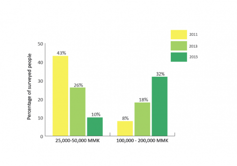 In addition, LIFT household surveys (2012, 2013 and 2015) uncover a considerable shift of households earning a ‘poor-level income’ to a ‘middle-level income’. The figure below shows that there has been a sharp increase in households reporting to have earned more than MMK 100,000 a month.