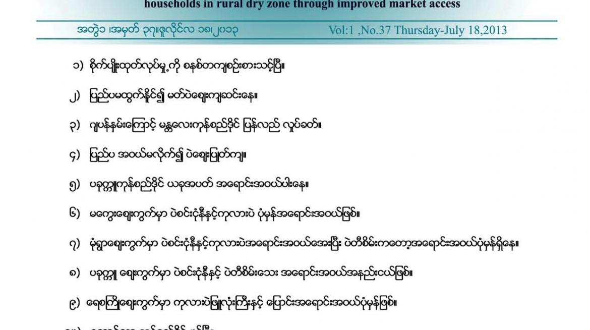 Current market prices of crops in Myanmar – Price this month of Japanese Sesame from Magway, Shan State; Pigeon Pea, Chick Pea and Green Pea from Magway, Pakokku and Monywa; Big Chickpea and Corn from Yayzagyo, Tamarind, Onion, etc. These prices are provided by LIFT’s partner MBCA and are sourced from commodity exchange centres. Agricultural information in the bulletin was extracted from journals and newspapers.