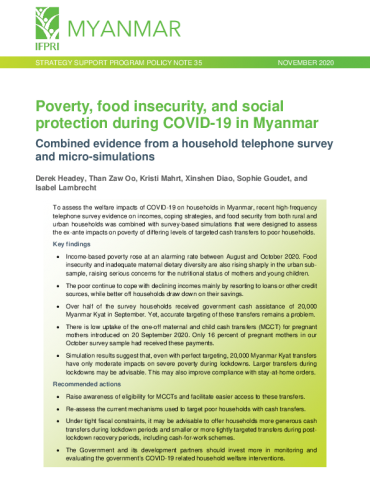 This study assesses the welfare impacts of COVID-19 on households in Myanmar by combining recent high-frequency telephone survey evidence for two specific rural and urban geographies with national-level survey-based simulations designed to assess exante impacts on poverty with differing amounts of targeted cash transfers.