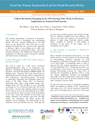 Fish farming (aquaculture) is important to Myanmar’s food security and is developing and transforming quickly. This brief presents findings from a new field survey of the farmed fish value chain that is more detailed and broader than any previous study conducted in Myanmar. Many of our findings are at odds with what we perceive as conventional wisdom about fish farming in Myanmar. The findings have important policy implications to unlock the sector’s full growth potential and food security contributions.