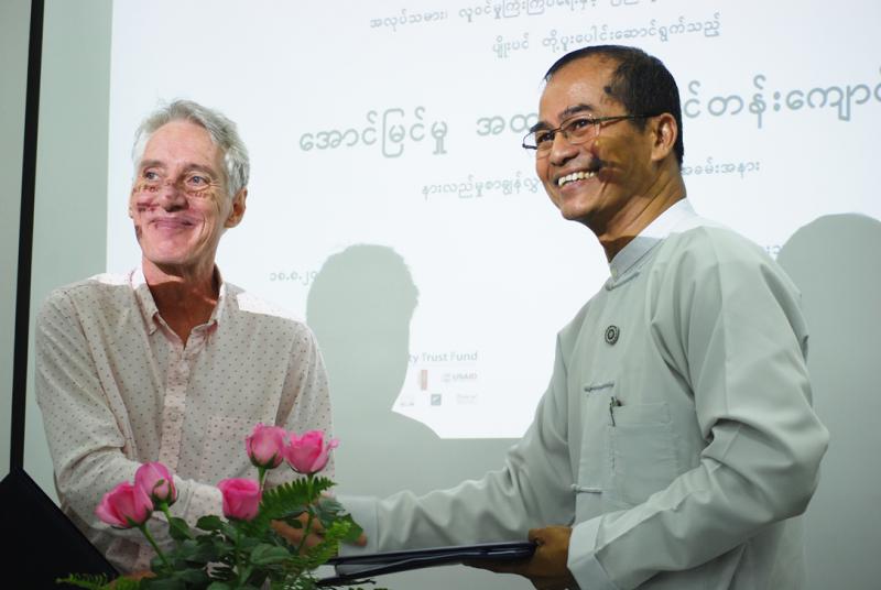 MOLIP Director General U Win Shein and Pyoe Pin representative Gerry Fox. Photo credit: LIFT