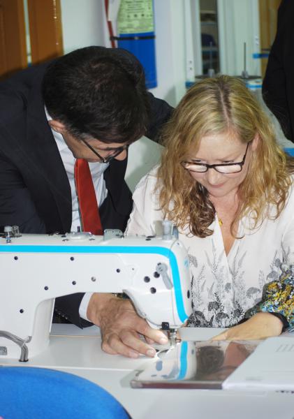 LIFT Fund Board Chair, Jo Raisin from the UK Department for International Development (DIFD) tests out a sewing machine. Photo credit: LIFT.