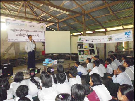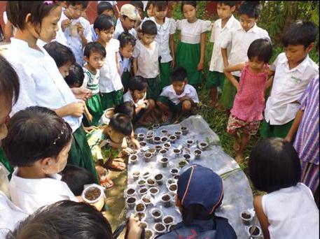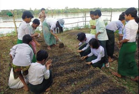 Teaching school children the importance of good nutrition, and giving them hands-on experience of growing their own food, was the focus of a sub-project implemented by Sympathy Hands Community Development Organisation. Over eight months in three villages of Kyaiklatt Township in the Ayeyarwady Delta, the ‘Capacity Building for Food Safety and Nutrition and School Gardening’' project involved three training events in the village school; on Good Agricultural Practices (GAP), on establishing school vegetable farming, and distributing Information, Education and Communication (IEC) materials focused on good nutrition, including DVDs and CDs.