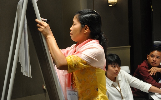 Ms. Nwe Ni Soe, Assistant Project Coordinator at METTA, writes disussion points for the inclusive value chains working group. Photo: LIFT