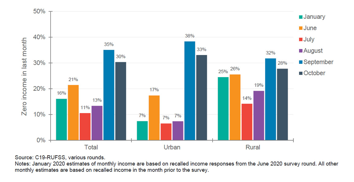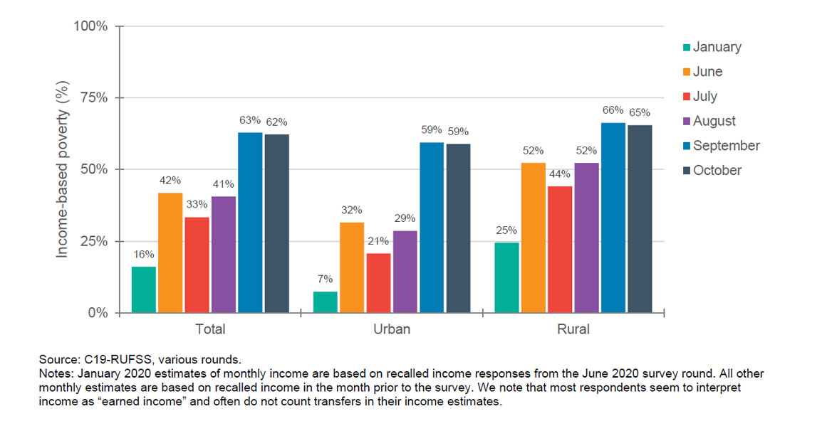 ဝင်ငွေမရှိတော့ခြင်းကြောင့် စားဝတ်နေရေးခက်ခဲလာမှုသည် ကိုဗစ်ပထမလှိုင်းဖြစ်ပွားသည့် ဇန်နဝါရီလမှ ဇွန်လအတွင်း အထူးသဖြင့် မြို့ပြဒေသများတွင် သိသိသာသာမြင့်တက်လာသည်။ ထို့နောက် အခြေအနေ အနည်းအကျဉ်းတိုးတက်လာသော်လည်း ဒုတိယလှိုင်းဖြစ်ပွားမှုနှင့် ဆက်စပ်ဆောင်ရွက်ရသည့် ထိန်းချုပ်မှုများသည် ခက်ခဲစွာ ရုန်းကန်နေရသည့် အိမ်ထောင်စုများ အပေါ် ရိုက်ခတ်လာတော့သည်။ အိမ်ထောင်စု ၃၅ရာခိုင်နှုန်းက စက်တင်ဘာလတွင် ဝင်ငွေတစ်ပြားမှ မရှိကြောင်းကို ဖြေကြားခဲ့ကြပြီး ထိုအခြေအနေမှာ အောက်တိုဘာလတွင် ၃၀ရာခိုင်နှုန်း ရှိသည်။ အပူပိုင်းဇုန် ကျေးလက်ဒေသများနှင့် ရန်ကုန်မြို့ပြဒေသများရှိ ကလေးငယ်များ သို့မဟုတ် ကိုယ်ဝန်ဆောင် ရှိသော အိမ်ထောင်စုများ၏ ထက်ဝက်ကျော်သည် နိုင်ငံတကာက သတ်မှတ် ထားသည့် ဆင်းရဲနွမ်းပါးမှုစံနှုန်း တစ်နေ့လျှင် အမေရိကန်ဒေါ်လာ ၁.၉၀ အောက်တွင် ရောက်ရှိ နေသည်။ ရန်ကုန်တွင် ကောက်ယူခဲ့သည့် အိမ်ထောင်စုများ၏ ၅၉ရာခိုင်နှုန်း (ဇန်နဝါရီတွင် ၇ရာခိုင်နှုန်းရှိခဲ့ရာမှ) နှင့် ကျေးလက်ကောက်ယူမှု၏ ၆၅ရာခိုင်နှုန်း (ဇန်နဝါရီတွင် ၂၅ရာခိုင်နှုန်း ရှိခဲ့ရာမှ) တို့သည် တစ်ရက်လျှင် မြန်မာငွေ ၈၉၀ ကျပ်(သို့မဟုတ်) အမေရိကန်ဒေါ်လာ ၁.၉၀ ထက် နည်းသည့် ဝင်ငွေသာရှိခဲ့သည်။ အိမ်ထောင်စုများ၏ နွမ်းပါးမှုမြင့်တက်လာသည်နှင့်အမျှ ယင်းအိမ်ထောင်စုများရှိ မိခင်များသည် စားနပ်ရိက္ခာမဖူလုံမှု၊ အစားအစာအမည်စုံ ဖူလုံစွာ မရရှိမှုကို ရင်ဆိုင်နေရသည်။ အထူးသဖြင့် မြို့ပြနေရာများတွင် ဖြစ်သည်။ ဇွန်လတွင် ရန်ကုန်ရှိ မိခင်များ၏ ၃၀ရာခိုင်နှန်းသည် အစားအစာအမျိုးအမည်စုံ ဖူလုံစွာ မစားသုံးခြင်းကို လေ့လာခဲ့ရသည်။ သိုသော်လည်း အောက်တိုဘာလတွင် ၄၉ရာခိုင်နှုန်းထိရှိလာခဲ့ရာ အဆိုပါ အခြေအနေသည် ၎င်းတို့ကိုယ်တိုင်အတွက်သာမက ၎င်းတို့ ရင်သွေးများ၏ အာဟာရကိုပါ ထိခိုက်မှုရှိလာသည်။