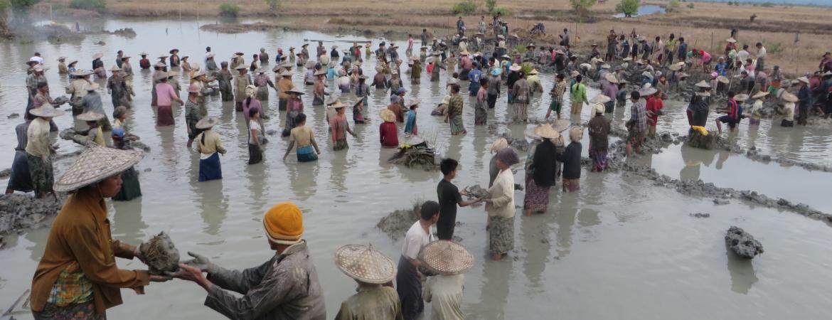 Only two and a half miles were damaged in Kyauk Phyu, Minbya and Myebon, where communities are now rebuilding these embankments with cash-for-work labourers. This community labour, which has a social protection commitment to employ vulnerable members of the community, has proved to be very effective.