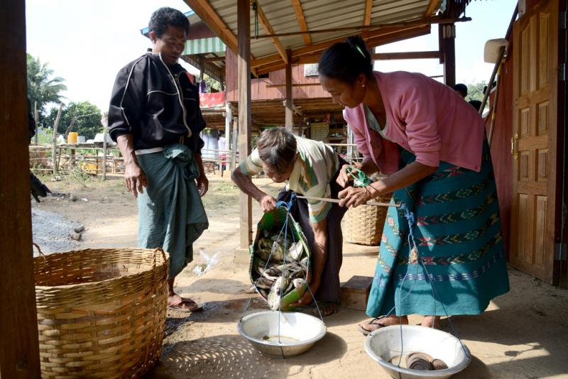 Than Min Aung's mother is helping him to weigh the fishes on scale to be ready to sell in the market.