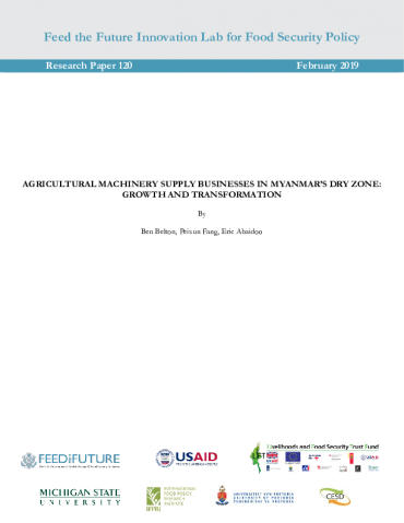 Myanmar is in the midst of a process of rapid agricultural mechanization. Previous research has documented the demand side of agricultural machine use (Filipski et al. 2018), and mechanization outsourcing services (Belton et al. 2018) in Myanmar’s Central Dry Zone – one of the country’s most important agricultural zones. This report presents findings on the supply side of agricultural mechanization, based on a survey of 57 agricultural machinery supply businesses in five urban centers, conducted in mid-December 2017. Together, these enterprises account for the majority of agricultural machinery supplied in the Dry Zone.